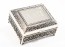 Polished silver footed jewelry box with beautiful antique detailing and a royal blue velvet interior.