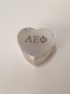 This sleek jewelry box has a heart shape and features the Alpha epsilon Phi letters engraved on the top surrounded by a ring of crystals. The silver material looks so polished and the velvet interior is roomy enough to hold more than one piece of jewelry. This box is the perfect gift for initiation or for a big sis or little sis! She will cherish it well past her treasured college years.