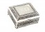 Polished silver footed jewelry box with beautiful antique detailing and a royal blue velvet interior.