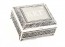 Polished silver footed jewelry box with beautiful antique detailing and a royal blue velvet interior.