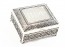 Polished silver footed jewelry box with beautiful antique detailing and a royal blue velvet interior.