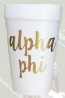 The sorority styrofoam cups have a beautiful gold colored script naming your sorority on them. Great for keeping your beverage cool longer than regular plastic cups.